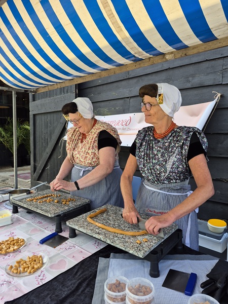 Op zaterdag 12 juli hebben we babbelaars gebakken voor de monumentale boerderij ‘Hof Welgelegen’ uit 1674 in het Pykeswegje te Goes. Het was een hele dag een komen en gaan van belangstellenden, in de schuur kregen ze informatie over de nieuw te bouwen woningen in Aria fase 12. Wij stonden bij de deur, men kwam langs het babbelaarkraam en we lieten zien hoe de babbelaars worden gemaakt. Als dank kregen we van de fa Fraanje nog een Zeeuws pakketje aangeboden. We kunnen terugzien op een leuk optreden met prima weer.